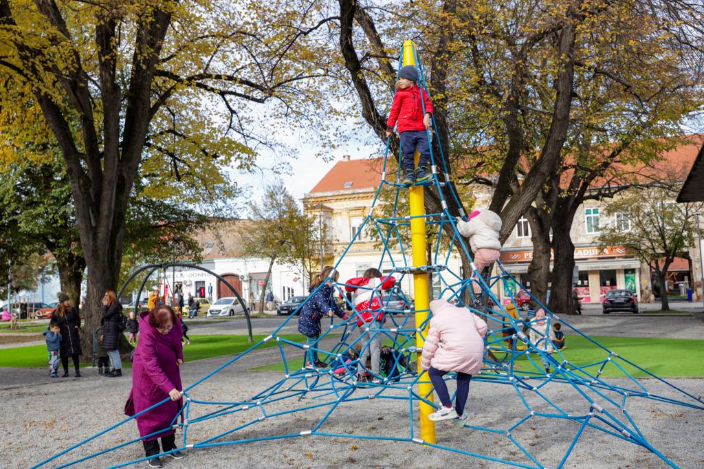Postavljeno je deset novih igrala, među kojima su i multifunkcionalna mreža za penjanje te trampolin – prva takva igrala na dječjim igralištima u Osijeku.